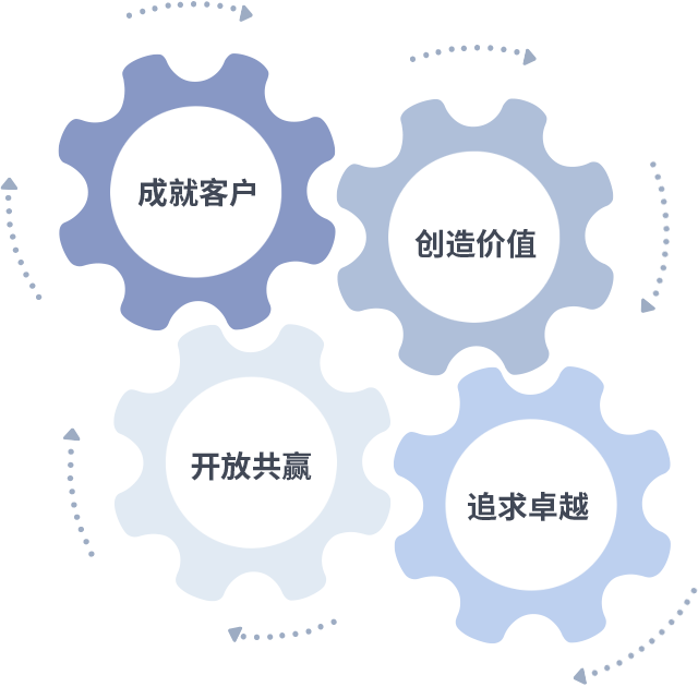 成就客戶是一切決策的出發(fā)點,創(chuàng)造價值是衡量所有工作的標準,追求卓越是我們做事做人的態(tài)度,開放共贏是我們的格局也是最終的結果。價值觀的齒輪環(huán)環(huán)相扣,推動著組織里的每個人不斷向前。